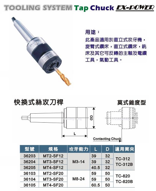 适用於直立式攻牙机、旋臂式钻床、直立式钻床、铣床及其他可反转的主轴及电钻工具、气动工具,可搭配扭力保护型丝攻夹头(可保护丝攻免於断裂)。