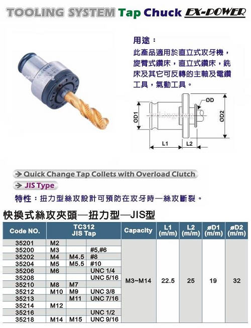 扭力保护型丝攻夹头(可保护丝攻免於断裂),适用於直立式攻牙机、旋臂式钻床、直立式钻床、铣床及其他可反转的主轴及电钻工具、气动工具。