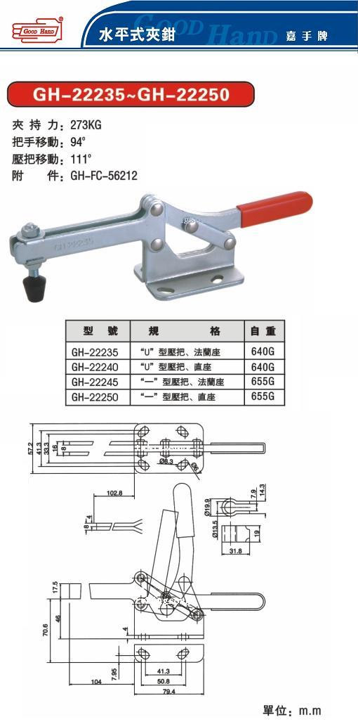 夹持力: 273kg. 把手移动:94? 压把移动:111 ? 附件:GH-FC-56212